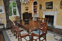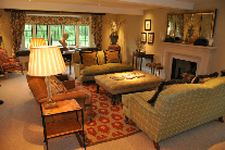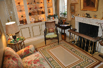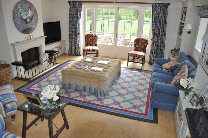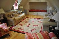 The interior decoration of this room was undertaken by E&E Designs. Being the “living” end of a large country kitchen with a stone floor used frequently for informal entertaining, the client wanted a warm and inviting room. We therefore designed the rug to pull together all the various colours. The upholstered stool, built by a trusted craftsman long known to us, has a deep bullion fringe selected to pick out the blues in the room and the natural colours of the stone floor and fireplace.