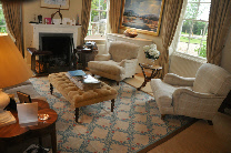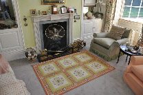The inspiration for this rug design came from a sample of Indian fabric. The client wanted a repetitive design which would not be spoilt by the large central stool in the middle. We therefore produced this design which married the darker colours from the urns, pictures and furniture, with the paler greens of the sofas.