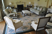 The interior decoration of this room was undertaken by E&E Designs. Being the “living” end of a large country kitchen with a stone floor used frequently for informal entertaining, the client wanted a warm and inviting room. We therefore designed the rug to pull together all the various colours. The upholstered stool, built by a trusted craftsman long known to us, has a deep bullion fringe selected to pick out the blues in the room and the natural colours of the stone floor and fireplace.